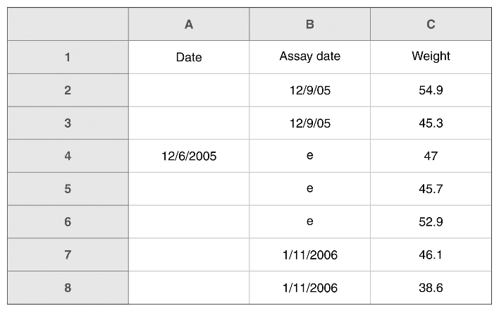 A spreadsheet with inconsistent date formats. This spreadsheet does not adhere to recommendations for consistency of date format. From Broman and Woo (2018). Also see https://xkcd.com/1179.