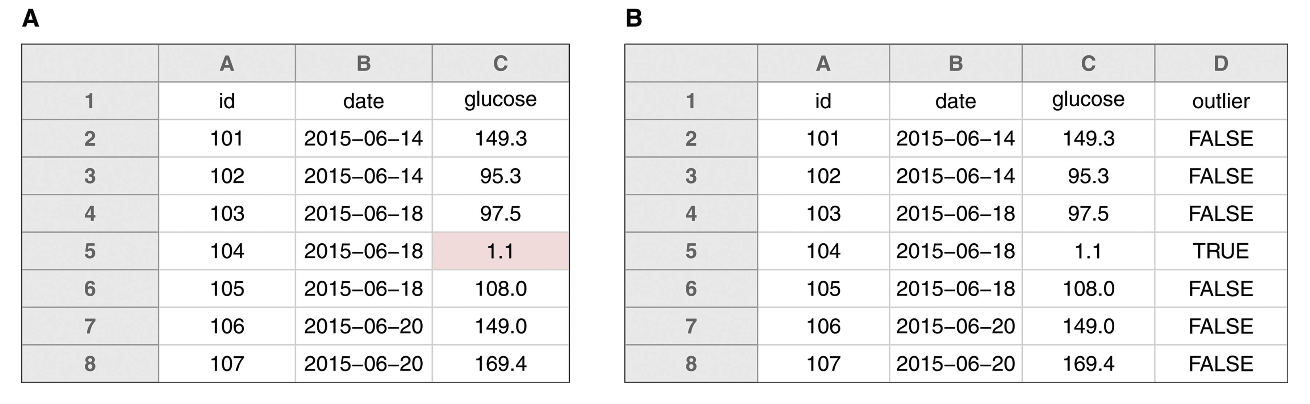 Highlighting in spreadsheets.(a) A potential outlier indicated by highlighting the cell.(b) The preferred method for indicating outliers, via an additional column, from Broman and Woo (2018).