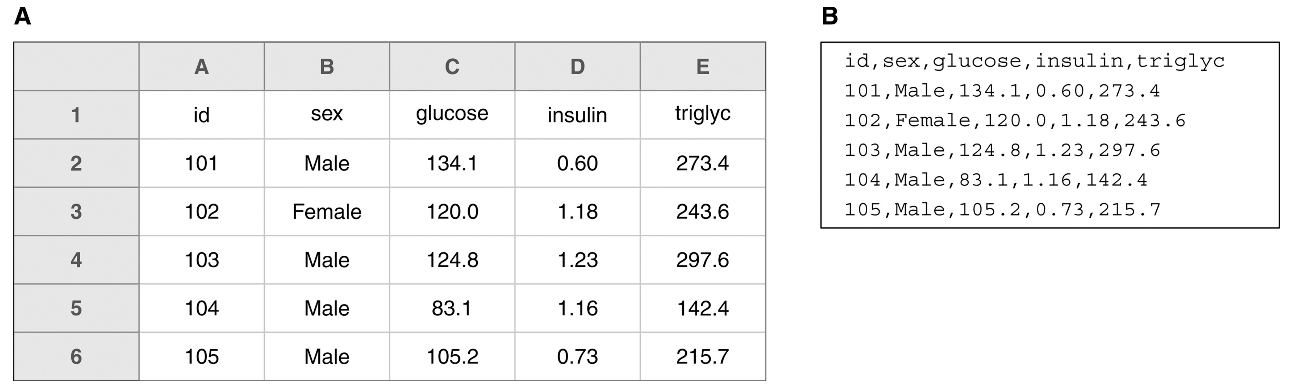 (a) An example spreadsheet. (b) The same data as a plain text file in CSV format, from Broman and Woo (2018).