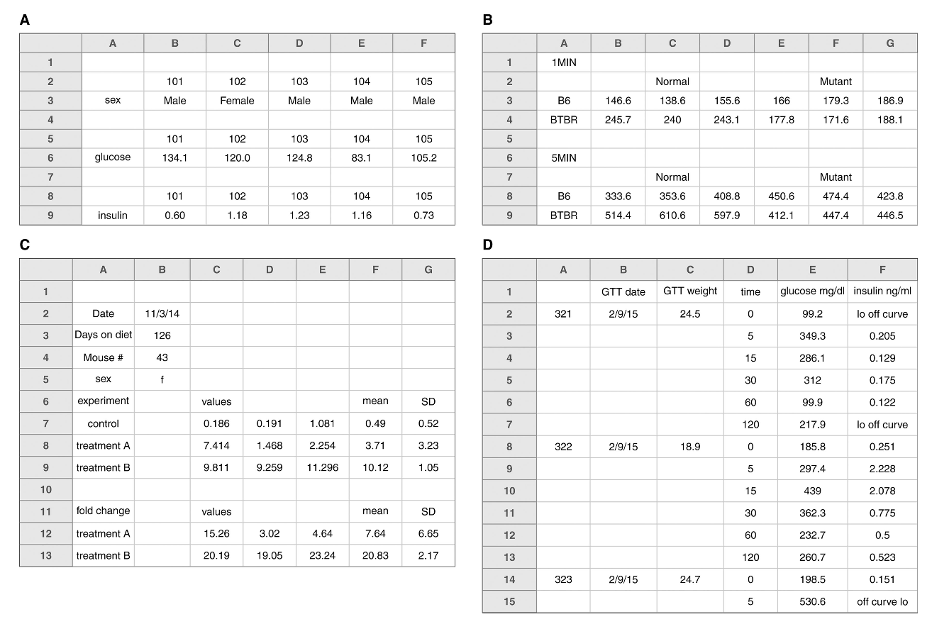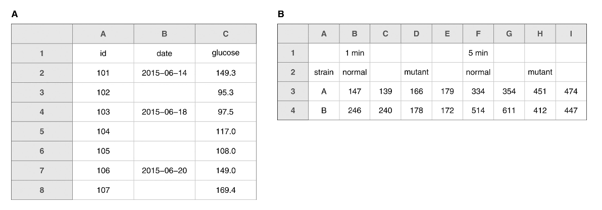 recommendation. (a) A spreadsheet where only the first of several repeated values was included. (b) A spreadsheet with a complicated layout and some implicit column headers, from Broman and Woo (2018).