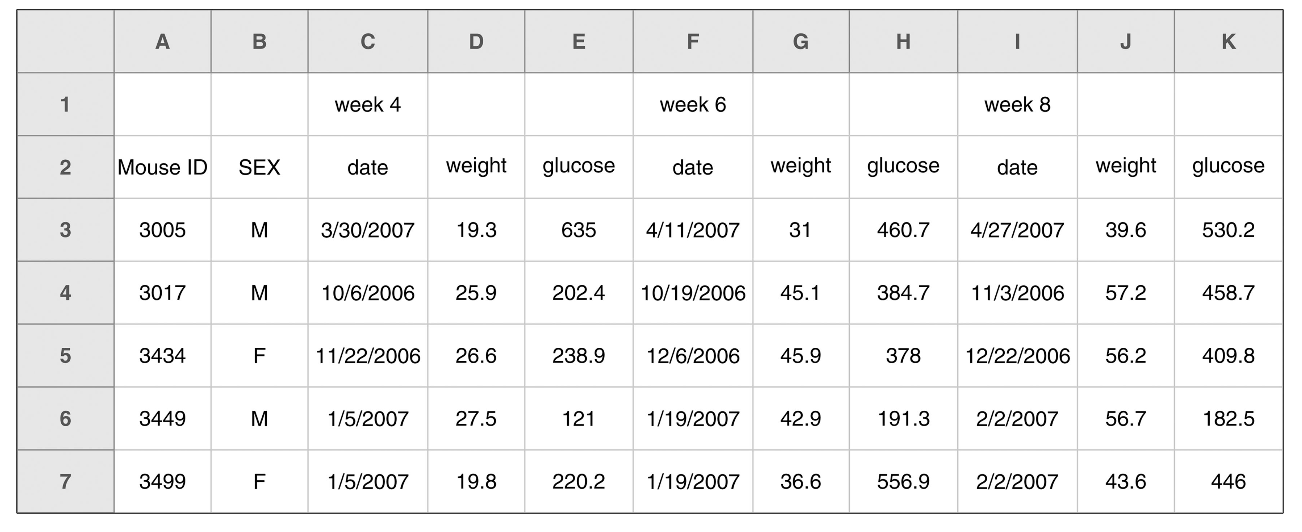 An example spreadsheet of the previous example’s data in a rectangular layout, from Broman and Woo (2018).